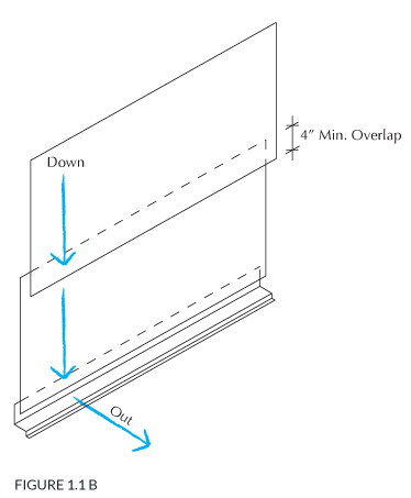 1. Building paper lapping: Install in a shingled fashion with the upper sheet always overlapping the lower sheet by a minimum of 4”. This and the down and out principle shown below.