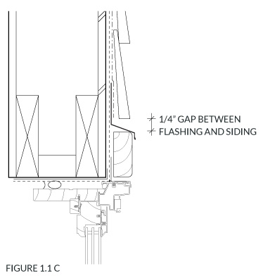 4. Leave a 1/4” minimum gap between cladding termination and sloped metal drip flashings, shown in figure 1.1 C (this detail can also apply to other flashing details such as: belly bands, exterior penetrations, etc.).
