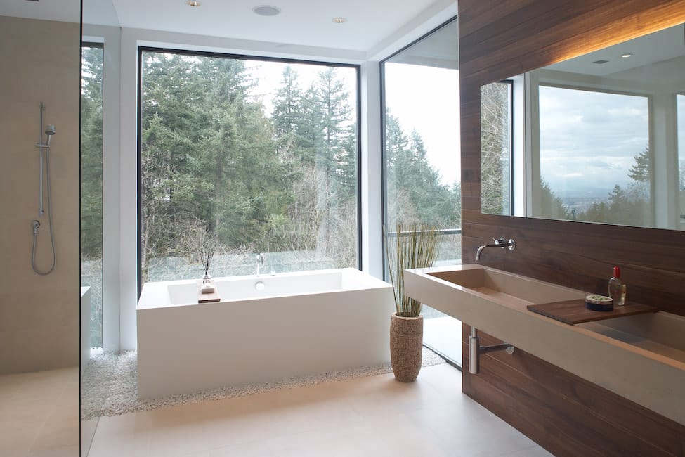 Oval tubs are a staple of most bathrooms, but that doesn’t mean you can’t opt for a more boxy bathtub. Rectangular tubs are becoming increasingly more popular and give any bathroom remodel a fresh modern look. This modern bathroom remodel designed by Skylab features a sleek rectangular tub with an amazing view.