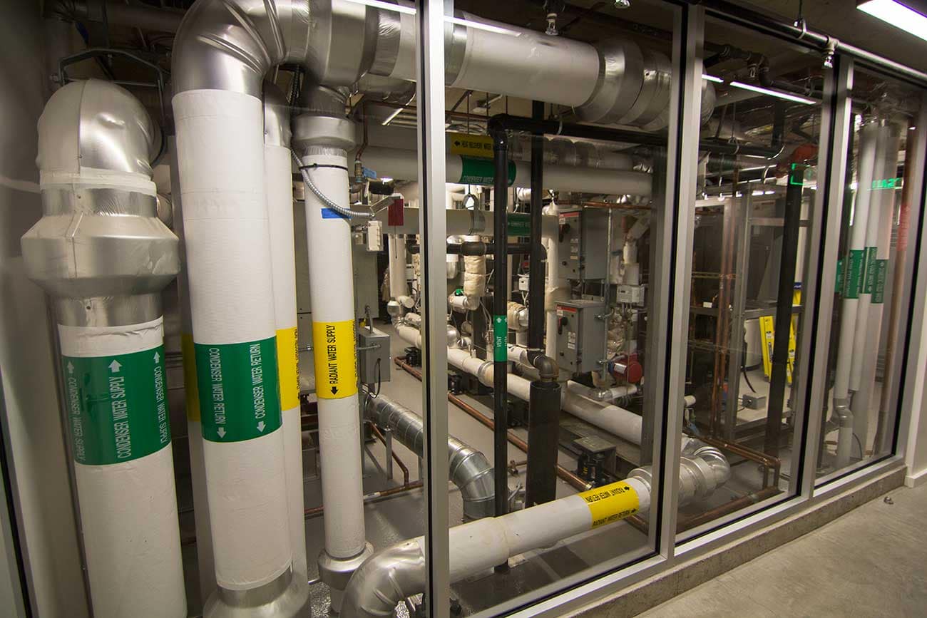 Next, Brad brought us to the mechanical room, with its display window and informational labels exhibiting the Bullitt Center’s heating and cooling system. Brad explained that while a typical office building’s heating and cooling consumes 40% of building energy, the Bullitt Center’s heating and cooling consumes just 2-3%. This modest load is readily handled by a ground source heat pump, whose efficiency gets a 15% boost from its ground loop, a series of 400′ deep wells, each 2″ in diameter, filled with a glycol mixture that cycles through, drawing cool energy from the earth in the summer and warm energy in the winter.