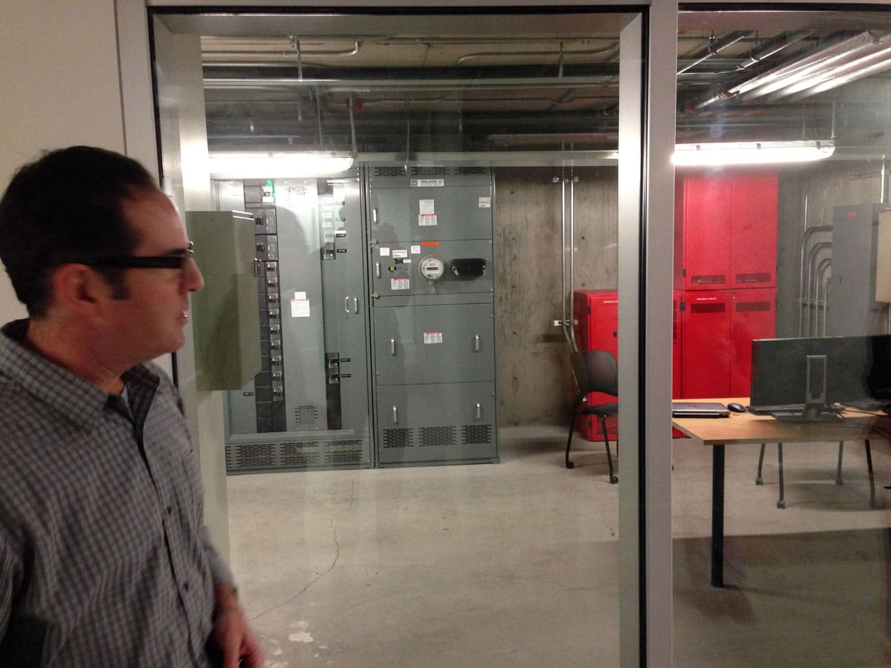 But back to our tour with the Bullitt Center’s Brad Kahn…our next stop was the electrical control room, fairly indistinguishable from that of any other office building, save for the fact that its electrical meter runs in both directions – forward in the winter months when the Bullitt Center consumes more energy than it produces, and backwards in the summer when it produces more than it consumes. To reach net zero, the sum of all that backward and forward spinning must be zero or better.
