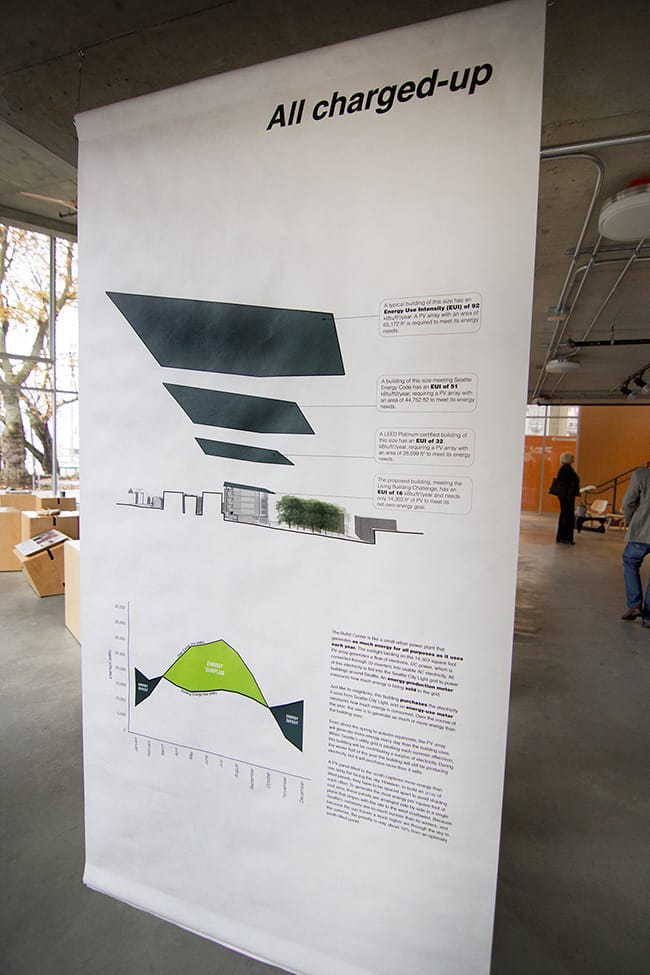The diagram shown on this banner from the Bullitt Center’s Discover Commons shows several representations of how large the rooftop solar array would have to be to accommodate the building’s energy needs and reach its net zero target. The massive “footprint” at the top of the diagram shows the array size required if the building were built like existing commercial buildings. The successively smaller footprints show the array size required if the building were built to Seattle energy code, built to LEED Platinum, and finally, built as it is today. Thanks to its focus on conservation (and its über-efficient solar cells), the Bullitt Center can reach net zero energy with a solar array that is built to the scale of the building, just barely jutting out over surrounding sidewalks.