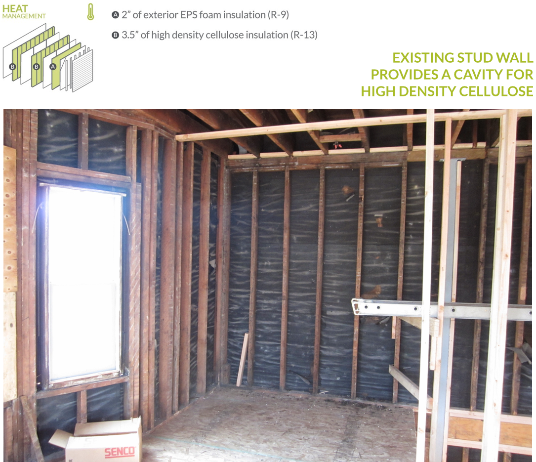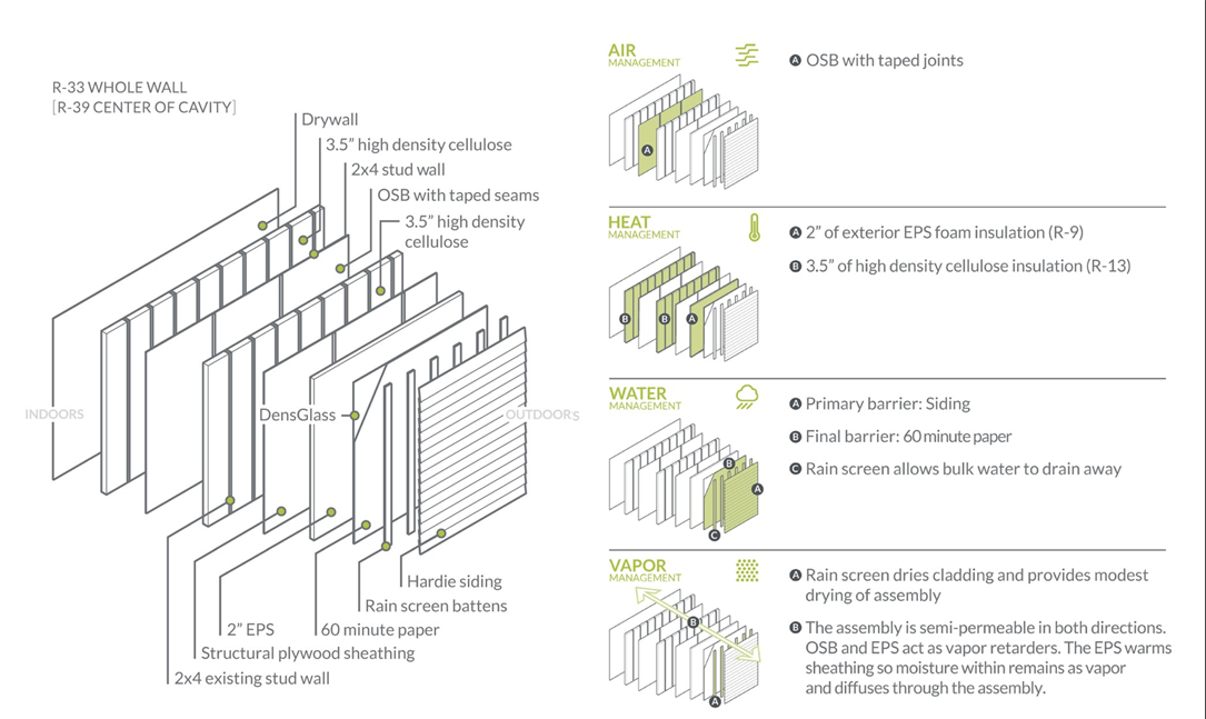 The two 2×4 stud walls are filled with high density cellulose insulation for a combined center of cavity insulative value of R-26. Two inches of continuous EPS foam insulation adds another R-9 to the assembly, and is only modestly thicker than the exterior insulation required by code. The sum of these three layers of insulation (plus sheet goods and air films) is R-33 whole wall and R-39 center of cavity.