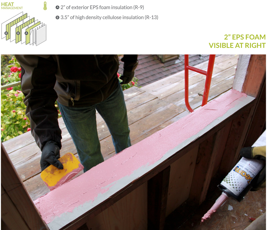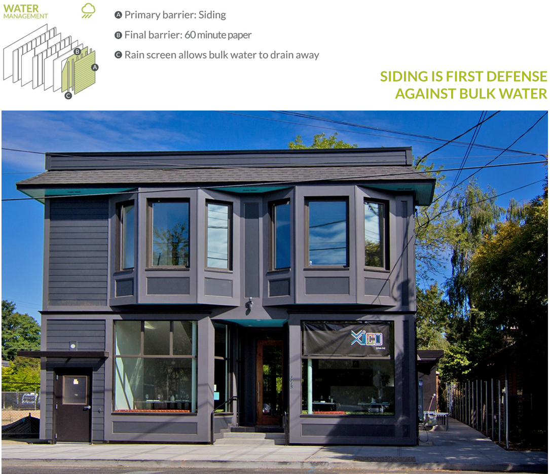 Glasswood’s Hardie siding provides the first line of defense from water intrusion, with a rain screen cavity behind that allows water to drain away. 60 minute paper provides the water-resistive barrier, while a continuous layer of DensGlass immediately outboard of the EPS adds code-required fire resistance to the assembly.