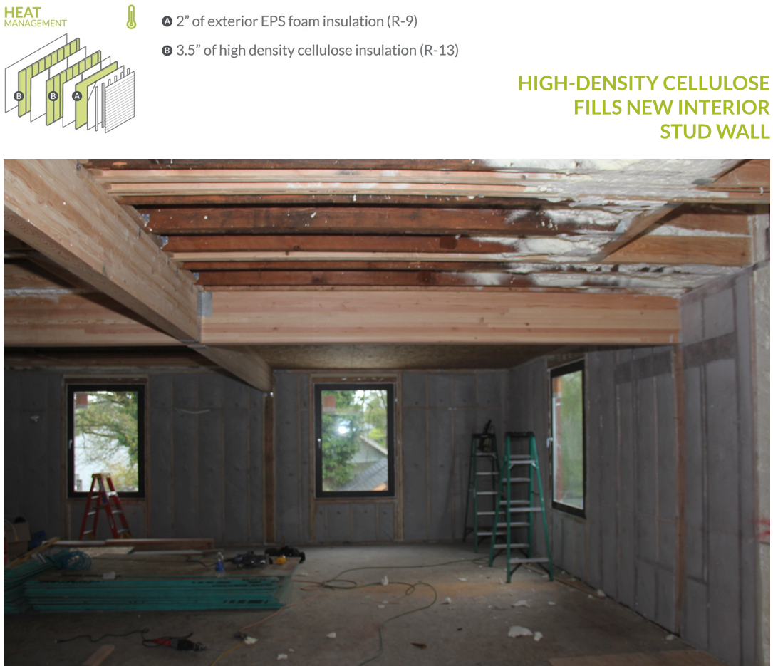 The two 2×4 stud walls are filled with high density cellulose insulation for a combined center of cavity insulative value of R-26. Two inches of continuous EPS foam insulation adds another R-9 to the assembly, and is only modestly thicker than the exterior insulation required by code. The sum of these three layers of insulation (plus sheet goods and air films) is R-33 whole wall and R-39 center of cavity.