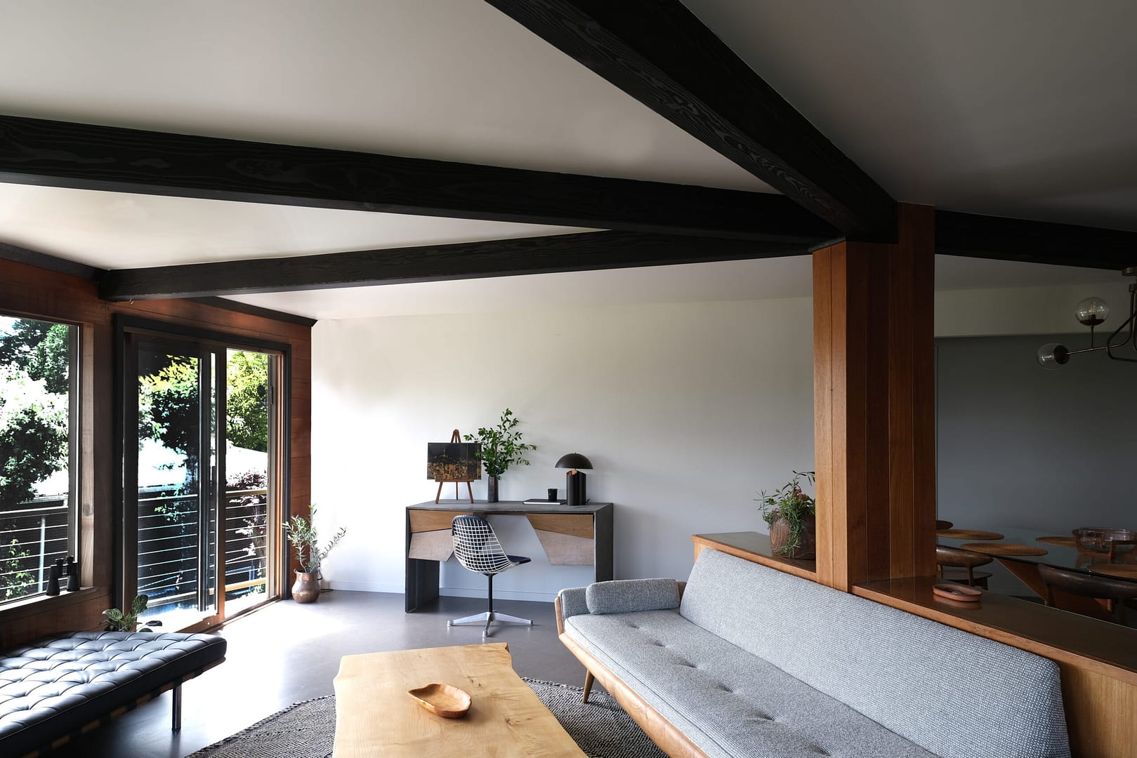 Hammer & Hand worked with Introspecs on remodeling this guest bath and primary suite to achieve a fresh and modern look while still feeling at home within this 1926 house. Layers of neutrals featuring unique patterns create a serene environment while lending texture and visual interest. The primary suite and walk-in closet feature extensive walnut cabinetry by Big Branch, while yards of handmade tile by Heath Ceramics adorn the guest bath walls.