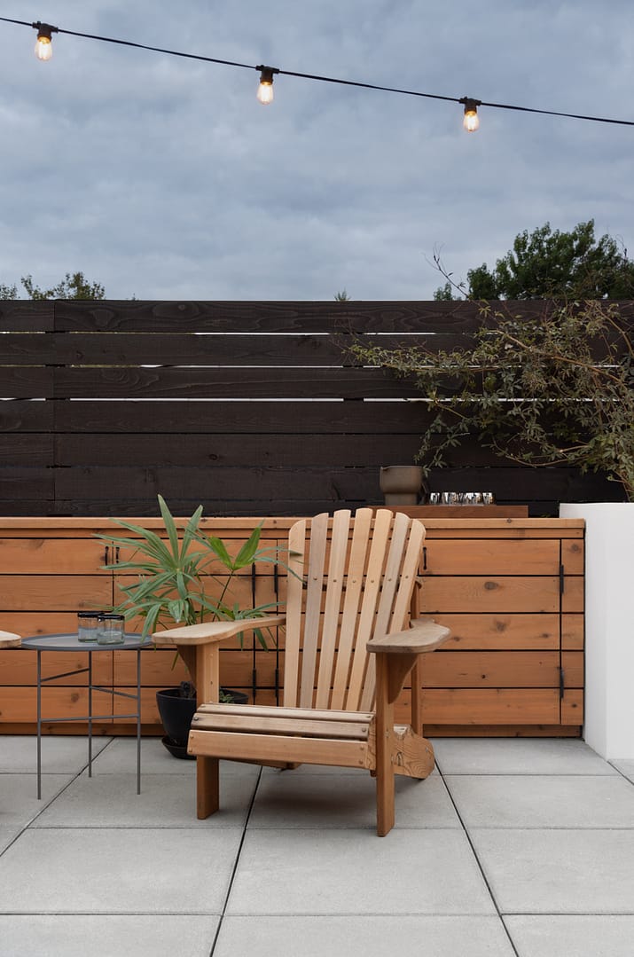 The transformed deck, centered around a modern fire pit table, is a perfect space for hosting.