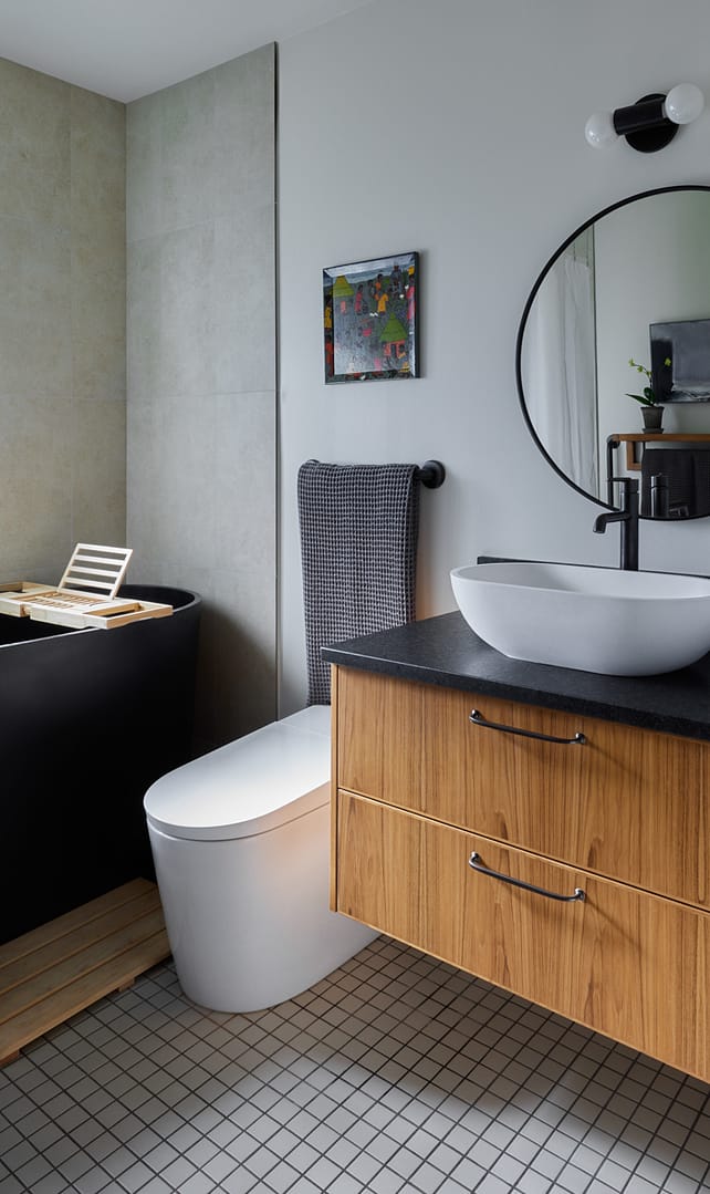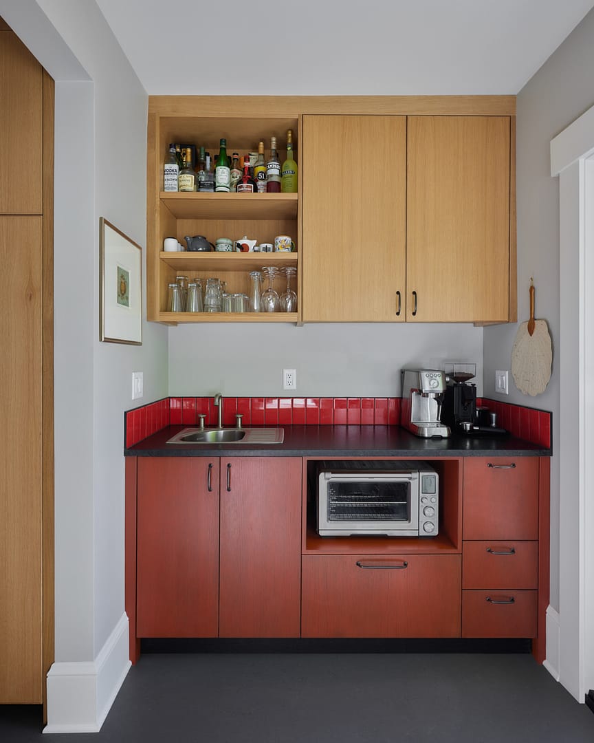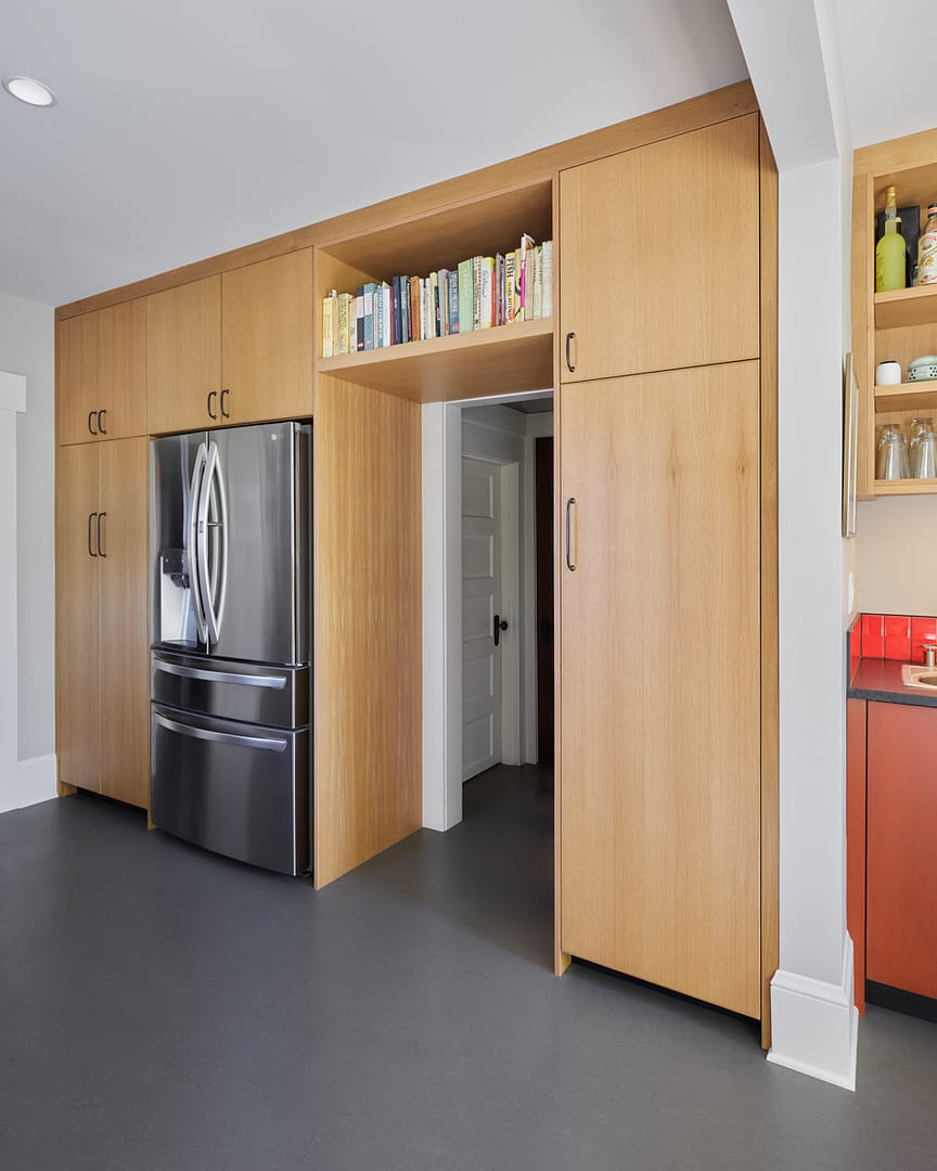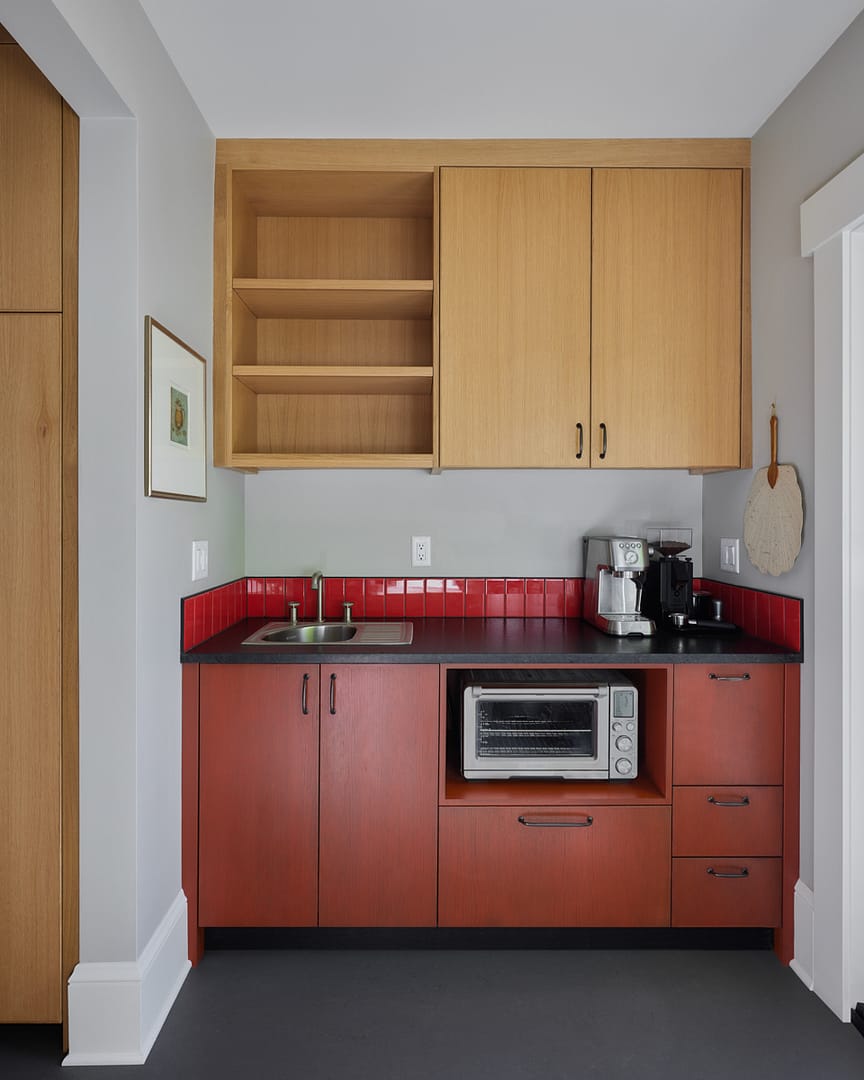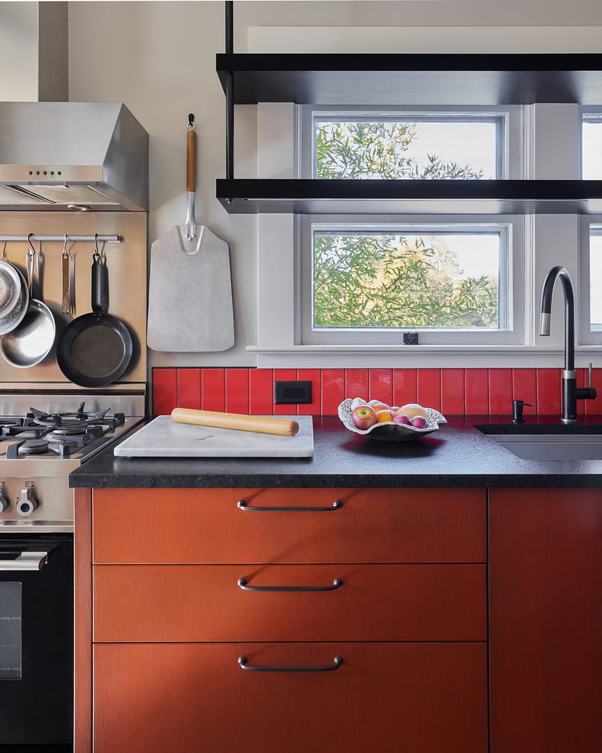 Custom cabinetry for a Portland artist’s kitchen and bathroom remodel, handcrafted in our woodshop and installed by our Portland team. Our client is an avid cook, and the smart layout by Bright Designlab makes use of every square inch, making space for their one-of-a-kind collections of cookware and cookbooks to shine. The delightful kitchen nook with under-cabinet lighting allows for morning coffees with a built-in space for a convection oven.