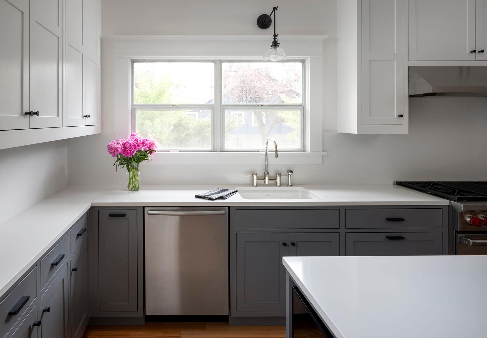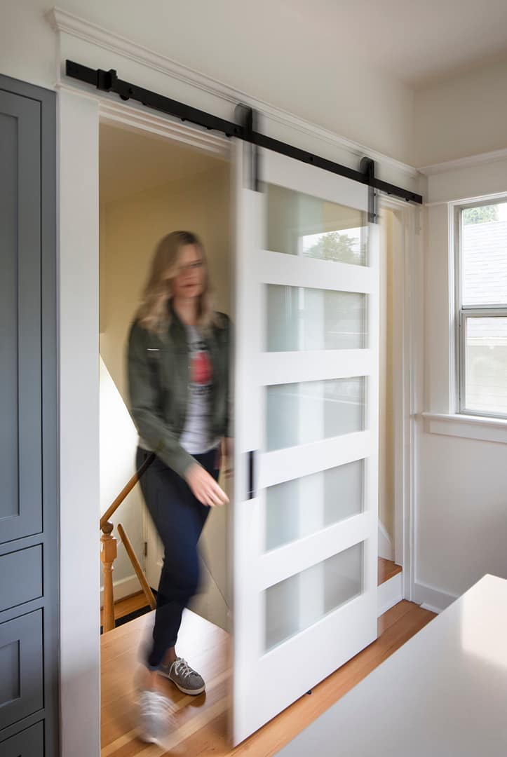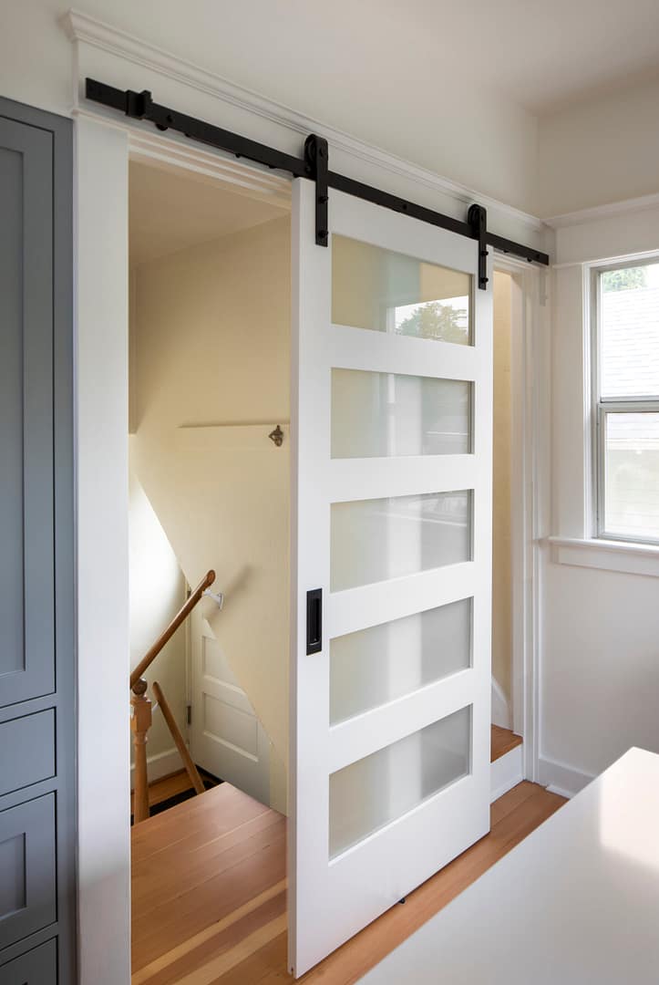 Perfectly simple and wholly modern, this kitchen in Sellwood, Portland makes a few nods to tradition. Our clients wanted an updated and more efficient kitchen with better circulation that would mesh well with the rest of their 1923 bungalow. This design includes clean cabinetry, simple materials, refinished original fir floors, and a contemporary sliding barn door. The island perfectly fits a couple of stools for sitting while prepping dinner or for entertaining guests. This simple palette of colors and materials will look great for years to come!